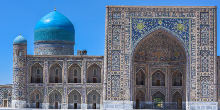 จตุรัสรีจีสตาน Registan Square อันโด่งดัง เป็นหนึ่งในสัญลักษณ์ของการท่องเที่ยวอุซเบกิสถาน ล้อมรอบสามด้านด้วยมัดดารอซะฮ์ Madrasah (ภาษาอาหรับ-สถานศึกษาทั้งของศาสนาและฆราวาส) ขนาดใหญ่ งดงามด้วยงานประดับแผ่นกระเบื้องสีสดจากบนลงล่าง มีโดมสีเทอร์ควอยส์อันโดดเด่น โดยผู้สร้างคือข้าหลวงชาวอุซเบ นามว่า ยาลังตุช บาคาดูร์ แต่เดิมสถานที่แห่งนี้เป็นตลาดชุมทางการค้า ที่ถนนหกสายภายในเมืองตัดมาบรรจบกัน ต่อมาจึงแปรเปลี่ยนเป็นลานสวนสนามของกองทัพ และลานประหารชีวิตนักโทษ