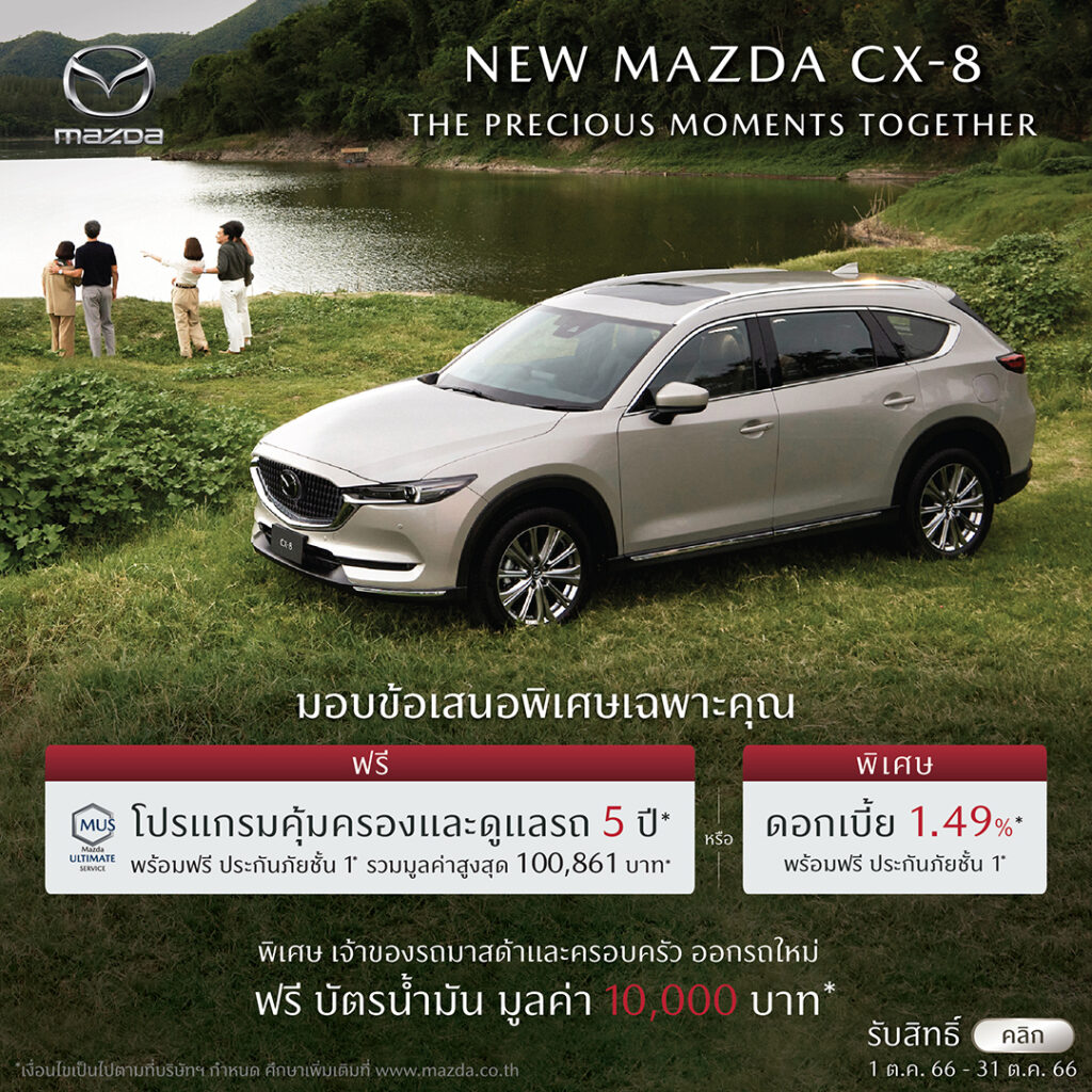 - Mazda CX-8: ดอกเบี้ย 2.39%1, ฟรีประกันภัยชั้นหนึ่ง Mazda Premium Insurance 1 ปี2, ฟรีโปรแกรมคุ้มครองและดูแลรถ 5 ปี Mazda Ultimate Service (MUS)4 หรือ ดอกเบี้ย 1.49%1, ฟรีประกันภัยชั้นหนึ่ง Mazda Premium Insurance 1 ปี2