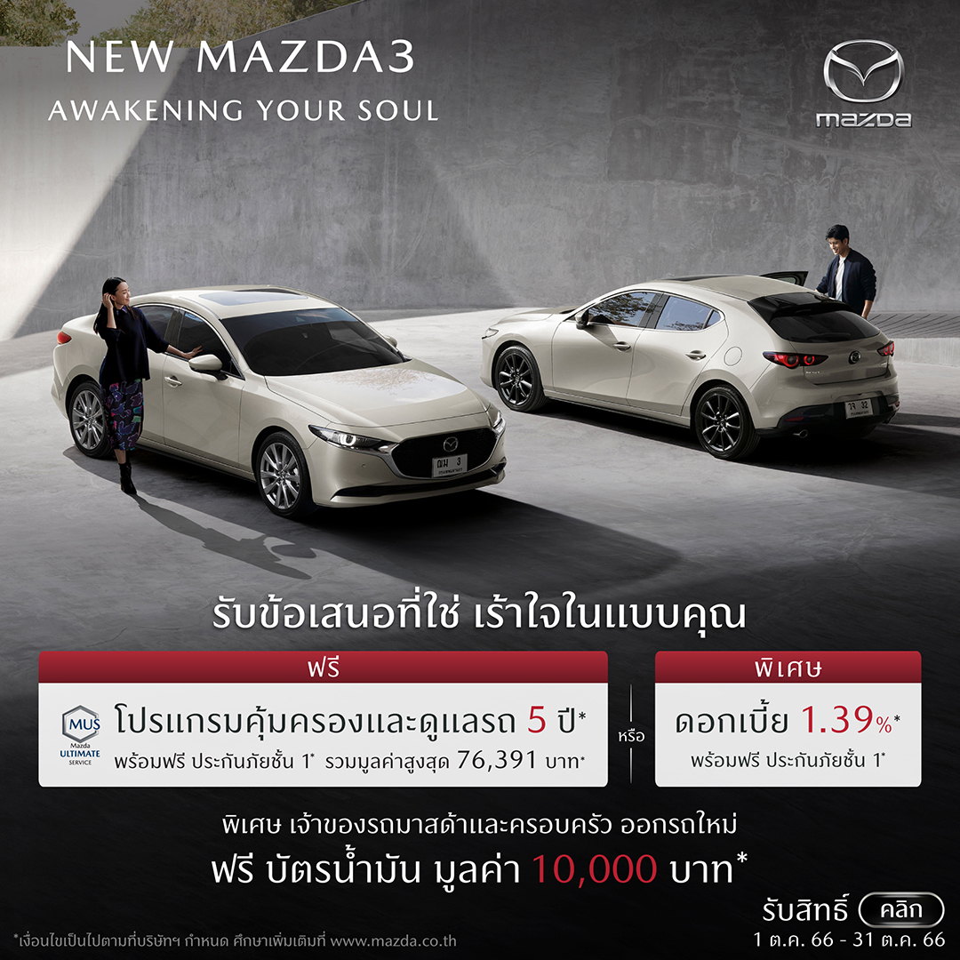 - Mazda3 และ Mazda3 CARBON EDITION: ดอกเบี้ย 2.39%1, ฟรีประกันภัยชั้นหนึ่ง Mazda Premium Insurance 1 ปี2, ฟรีโปรแกรมคุ้มครองและดูแลรถ 5 ปี Mazda Ultimate Service (MUS)4 หรือ ดอกเบี้ย 1.39%1, ฟรีประกันภัยชั้นหนึ่ง Mazda Premium Insurance 1 ปี2