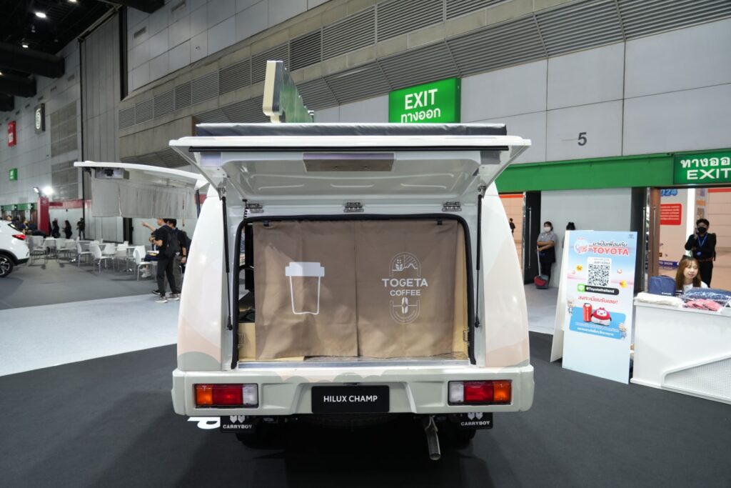 “HILUX CHAMP” ให้ทุกโอกาสเป็นไปได้ กับ ไฮลักซ์ แชมป์ ใหม่ กระบะท้ายเรียบพร้อมดัดแปลง แบบเปิดได้ 3 ทาง เพิ่มความสามารถในการบรรทุก สะดวกและทนทาน พร้อมโครงสร้างที่เอื้อต่อการดัดแปลง ช่วยลดต้นทุนและเวลา ลดค่าใช้จ่ายให้กับผู้ประกอบการ ตอบโจทย์การใช้งานทั้งเชิงพาณิชย์และการใช้งานส่วนตัว ให้คุณเป็นอะไรก็ได้ ทำอะไรก็ได้ ไปไหนก็ได้กับ ไฮลักซ์ แชมป์ ภายในงานได้มีการนำรถไฮลักซ์ แชมป์ มาดัดแปลงเป็นร้านกาแฟเคลื่อนที่ของแบรนด์ TOGETA ซึ่งเป็นแบรนด์คาเฟ่จากโตโยต้า เปิด-ปิดง่าย และปลอดภัยด้วยเซฟตี้โช้คอัพ Build-in ฟังชั่นเป็นสัดส่วนครบครัน ทั้งพื้นที่ใช้งานและพื้นที่เก็บของ รองรับการใช้งานร้านกาแฟได้จริง พร้อมติดตั้งถังน้ำแข็ง ตู้แช่นม ออกแบบเพิ่มฟังก์ชันการวางอุปกรณ์ เครื่องชง ไซรัป และตู้เย็นเล็กฝั่งคนชงให้สามารถทำงานได้อย่างคล่องตัว ติดตั้งระบบน้ำและระบบไฟ พร้อมใช้งาน
