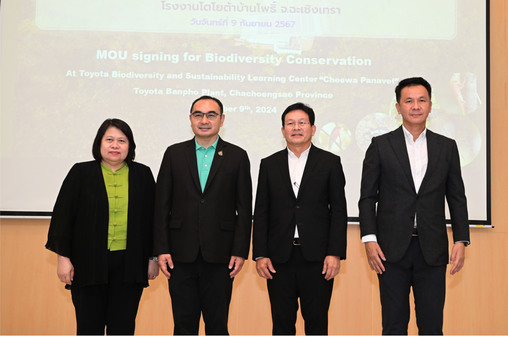 นายสุวิทย์ ไชยประสิทธิ์ ผู้ช่วยกรรมการผู้จัดการใหญ่ บริษัท โตโยต้า มอเตอร์ ประเทศไทย จำกัด และนายประเสริฐ ศิรินภาพร เลขาธิการ สำนักงานนโยบายและแผนทรัพยากรธรรมชาติและสิ่งแวดล้อม (สผ.) ร่วมลงนามในบันทึกความเข้าใจ (MOU) เพื่อร่วมมือในการดำเนินงานด้านการอนุรักษ์ความหลากหลายทางชีวภาพ ยกระดับพื้นที่ศูนย์การเรียนรู้ความหลากหลายทางชีวภาพและความยั่งยืน “ชีวพนาเวศ”ภายในโรงงานโตโยต้าบ้านโพธิ์ สู่การเป็นต้นแบบ “พื้นที่อนุรักษ์ความหลากหลายทางชีวภาพนอกเขตพื้นที่คุ้มครอง (OECMs)” ที่จัดการโดยเอกชน โดยมี มร. ทัตสึชิ นิชิโอะกะ อัครราชทูต ประจำสถานเอกอัครราชทูตญี่ปุ่น ประจำประเทศไทย ร่วมเป็นสักขีพยาน ณ โรงงานโตโยต้า บ้านโพธิ์ จ.ฉะเชิงเทรา เมื่อวันที่ 9 กันยายน 2567 ที่ผ่านมา